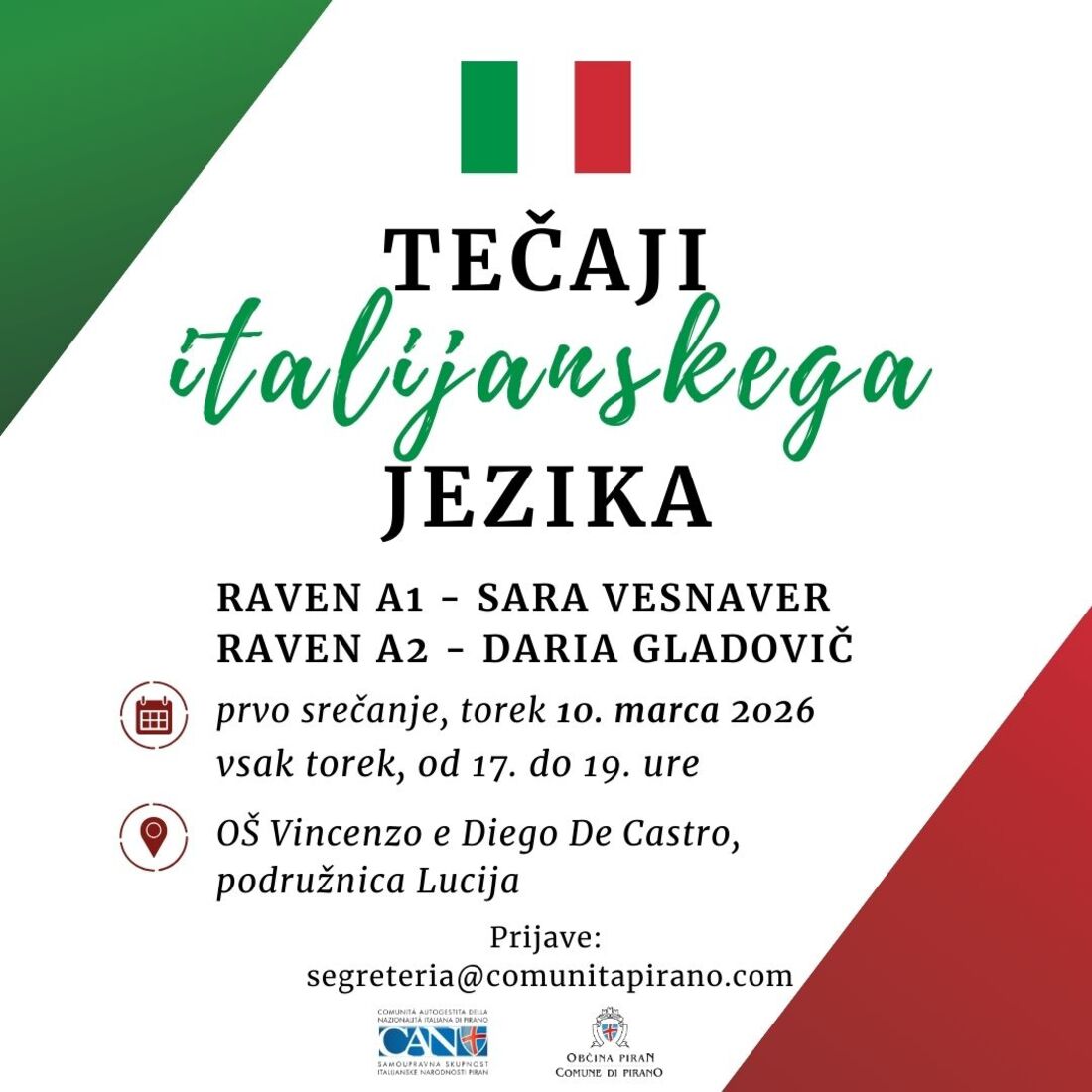 Občina Piran obvešča, da Comunità Autogestita della Nazionalità Italiana di Pirano tudi letos organizira tečaje italijanskega jezika, in sicer na osnovni ravni (A1) in nadaljevalni ravni (A2).